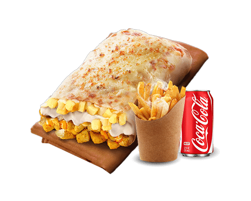 Poulet curry, oignons crispy, sauces au choix, boursin nature, gratiné mozzarella. Avec frites maison et sauce fromagère.